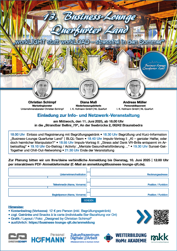 Ihr/dein BLQL-Organisationsteam lädt Sie/dich in Kooperation mit dem Projekt-Team „Zukunftszentrum Digitale Arbeit Sachsen-Anhalt“ der Hochschule Merseburg herzlich zum Summer-Opening am Geiseltalsee im Rahmen der „13. Business-Lounge Querfurter Land“ unter dem Motto „workLIGHT statt workLOAD – stressfrei in den Sommer“ ein.